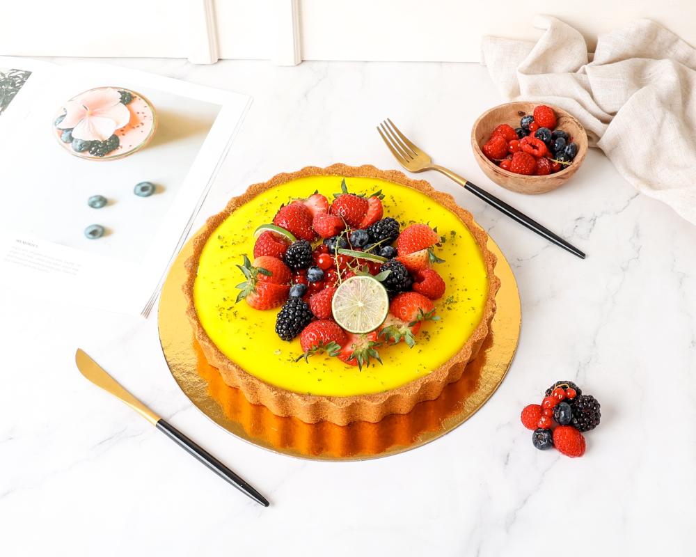 A crisp tart crust filled with a blend of vanilla and lime custard, topped with a layer of fresh lime juice sauce, and beautifully garnished with a selection of delicious imported fruits — offering a refreshing, citrusy dessert experience.